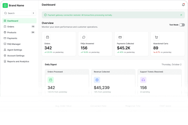 Track conversation volume, resolution rates, customer satisfaction, and AI performance. Identify trends and continuously improve responses.